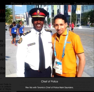 Zenji Nio made history by launching a Samurai Buddhist Museum inside the Athlete's Village and was given the highest security clearances to do so. Here Zenji Nio and Police Chief Mark Saunders discuss security arrangements for museum treasures on display inside the Athlete's Village.