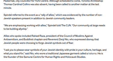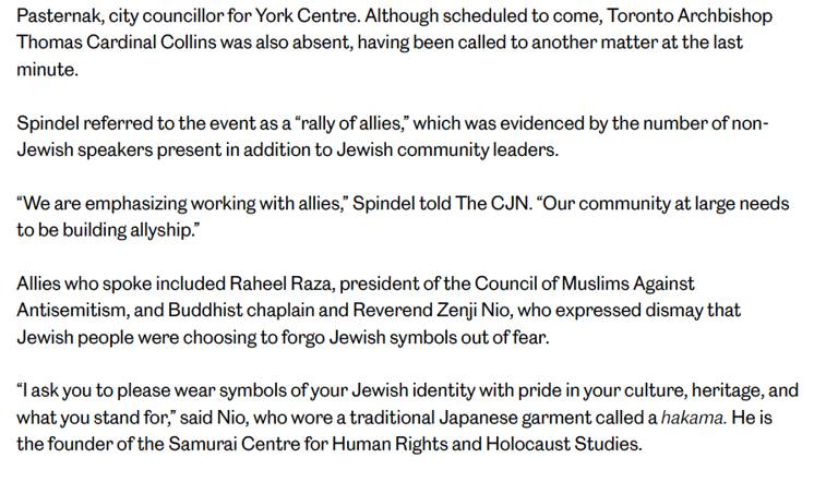 Canadian Jewish News praised Zenji Nio for his fight against antisemitism and Jew hatred and the work done by the Samurai Center for Human Rights which combats hatred, bigotry and inhumanity in all its forms as well as stands up for the victimized and marginalized.