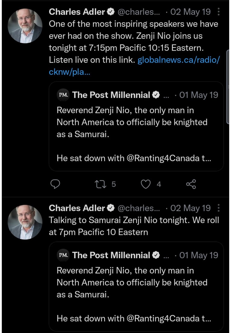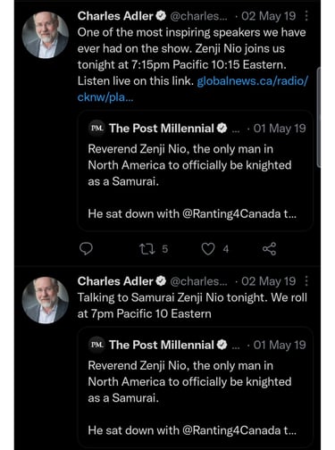 Emmy-Winner Charles Adler -- Canada's biggest pundit praises Zenji Nio for becoming the only North American ever to be knighted as a Samurai. Zenji Nio uses the Samurai Bushido to revolutionize Buddhism and to confront corruption and oppression as well as bring in social reform.