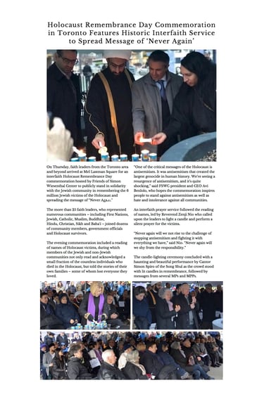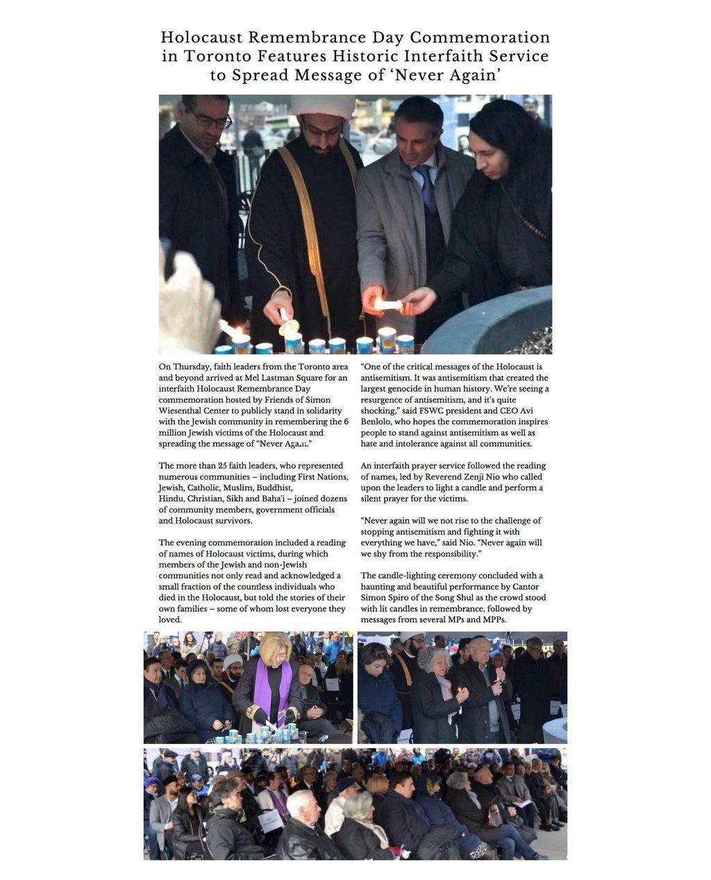 Along with world famous FSWC Simon Wiesenthal Center, Zenji Nio organized a National Enclave against antisemitism and Jew hatred covered by leaders from across Canada. Zenji Nio also organized and led the first Multifaith commemoration of the Holocaust and has stood for human rights across the world giving a voice to victims of hate, bigotry and oppression.