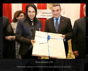 Zenji Nio honored by Parliamentary Secretary to the Prime Minister of Canada for his years of charitable works on behalf of the most vulnerable and marginalized communities.